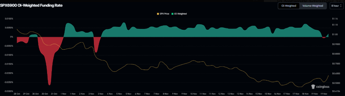 Trên thị trường phái sinh, tín hiệu cũng nghiêng về kịch bản SPX6900 bước vào pha hồi phục. Tỷ lệ funding rate từ Coinglass cho thấy tỷ lệ trader đặt cược vào kịch bản giảm giá đã thu hẹp đáng kể so với phe Long.