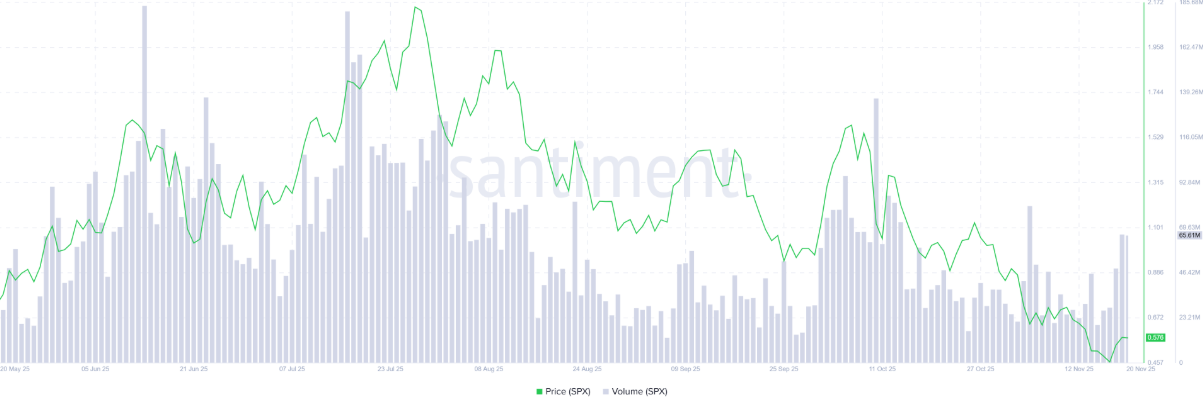 Giá SPX6900 đã quay lại kiểm tra vùng hỗ trợ gần đáy ngày 10/10 ở mức 0,44 USD trong phiên thứ Hai, trước khi bật tăng mạnh 26% chỉ trong hai ngày tiếp theo. Tính đến thời điểm viết bài vào thứ Năm, SPX vẫn duy trì sắc xanh và dao động quanh mốc 0,58 USD.