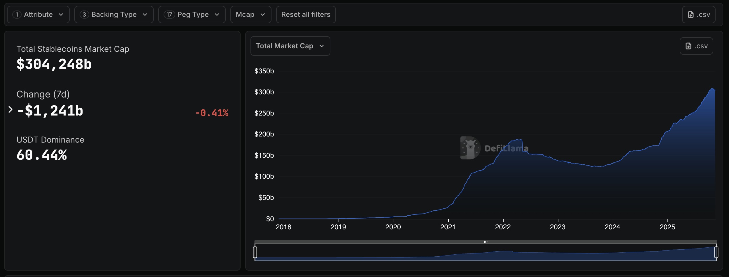 Dữ liệu từ defillama.com cho thấy tổng giá trị thị trường stablecoin hiện ở mức 304,248 tỷ USD, giảm 0,41% so với tuần trước. Mức giảm này không đồng đều giữa các đồng tiền; một số tăng nhẹ, một số giảm mạnh, phản ánh tâm lý đa dạng của nhà đầu tư.