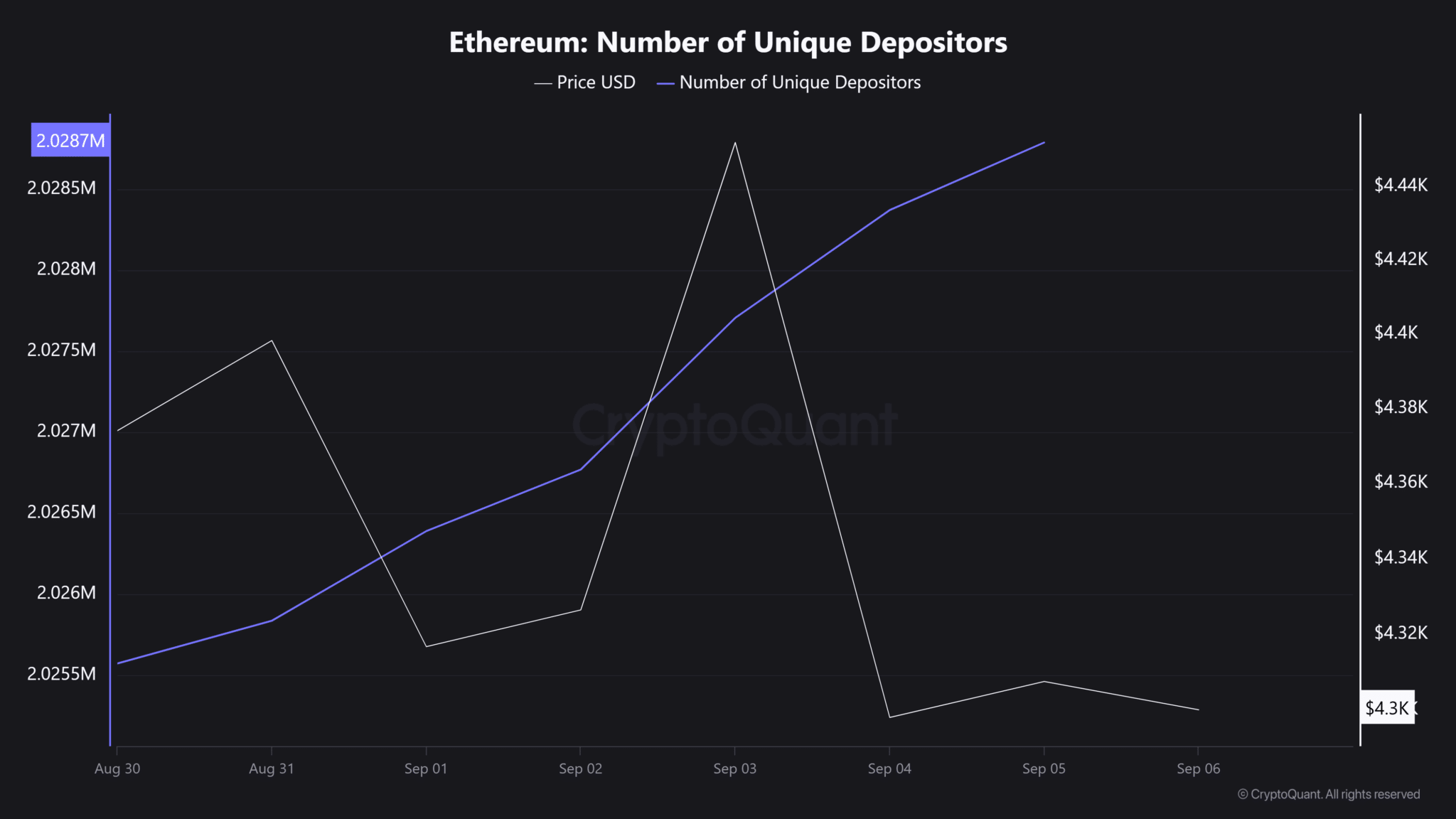 Ngoài ra, số lượng địa chỉ nạp ETH duy nhất (unique depositor) trên mạng Ethereum cũng đã phát tín hiệu tích cực, với xu hướng đi lên liên tục trong suốt tuần qua và hiện đã đạt con số hơn 2 triệu địa chỉ.