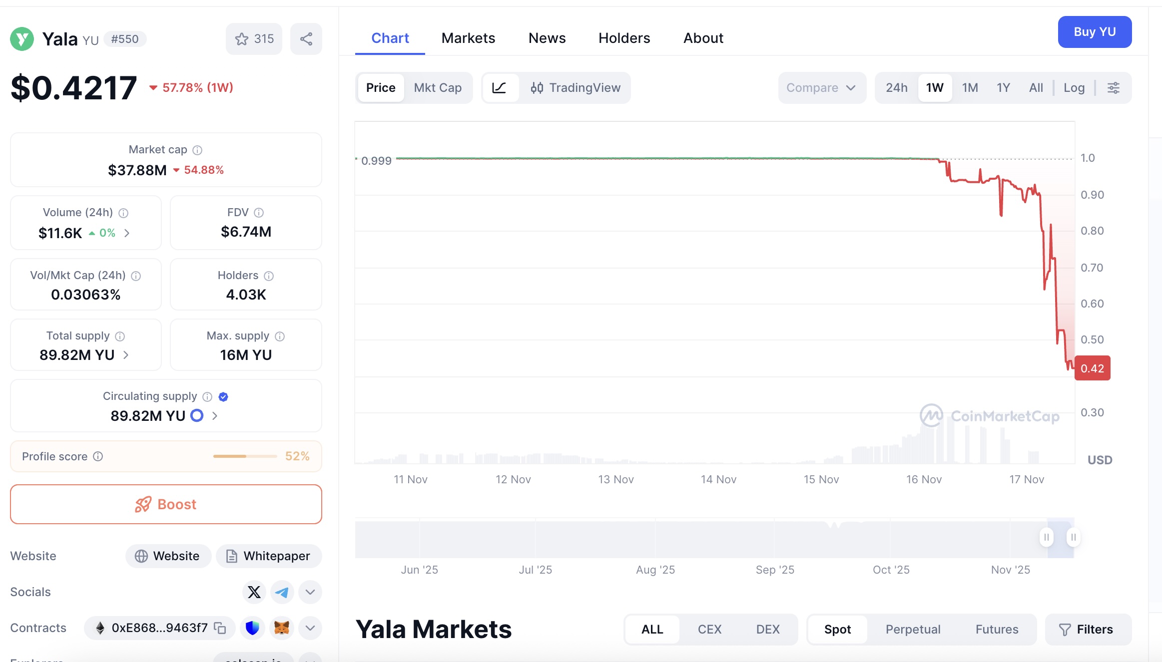 Theo CoinMarketCap, Yala (YU) đã giảm 57,78% trong 24 giờ qua, xuống mức 0,4217 USD, với vốn hóa thị trường còn 37,88 triệu USD và khối lượng giao dịch giảm 98,7%, chỉ còn 11,6 nghìn USD. Đồng stablecoin này lần đầu mất peg vào khoảng 4:15–5:00 sáng, sau đó hồi phục tạm thời trước khi rơi xuống 0,42 USD và không thể phục hồi.
