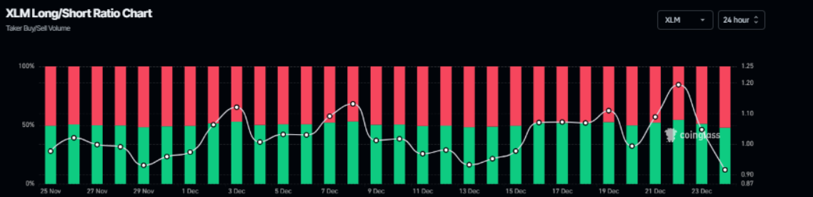 Bên cạnh đó, tỷ lệ long/short của XLM được Coinglass ghi nhận ở mức 0,91 — cao nhất trong hơn một tháng. Dù có sự cải thiện so với giai đoạn trước, tỷ lệ vẫn nằm dưới ngưỡng 1, cho thấy tâm lý thị trường nhìn chung vẫn nghiêng về phe gấu, khi số lượng vị thế đặt cược vào khả năng giá XLM đi xuống vẫn chiếm ưu thế.