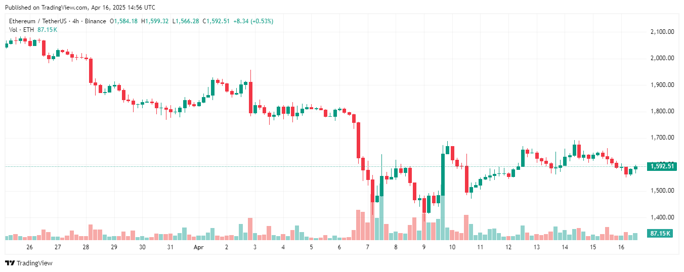 Giá ETH đã giảm hơn 61% trong suốt xu hướng giảm kéo dài bốn tháng, bắt đầu từ ngày 16/12/2024, khi ETH tạm thời đạt đỉnh trên mức 4.100 đô la.