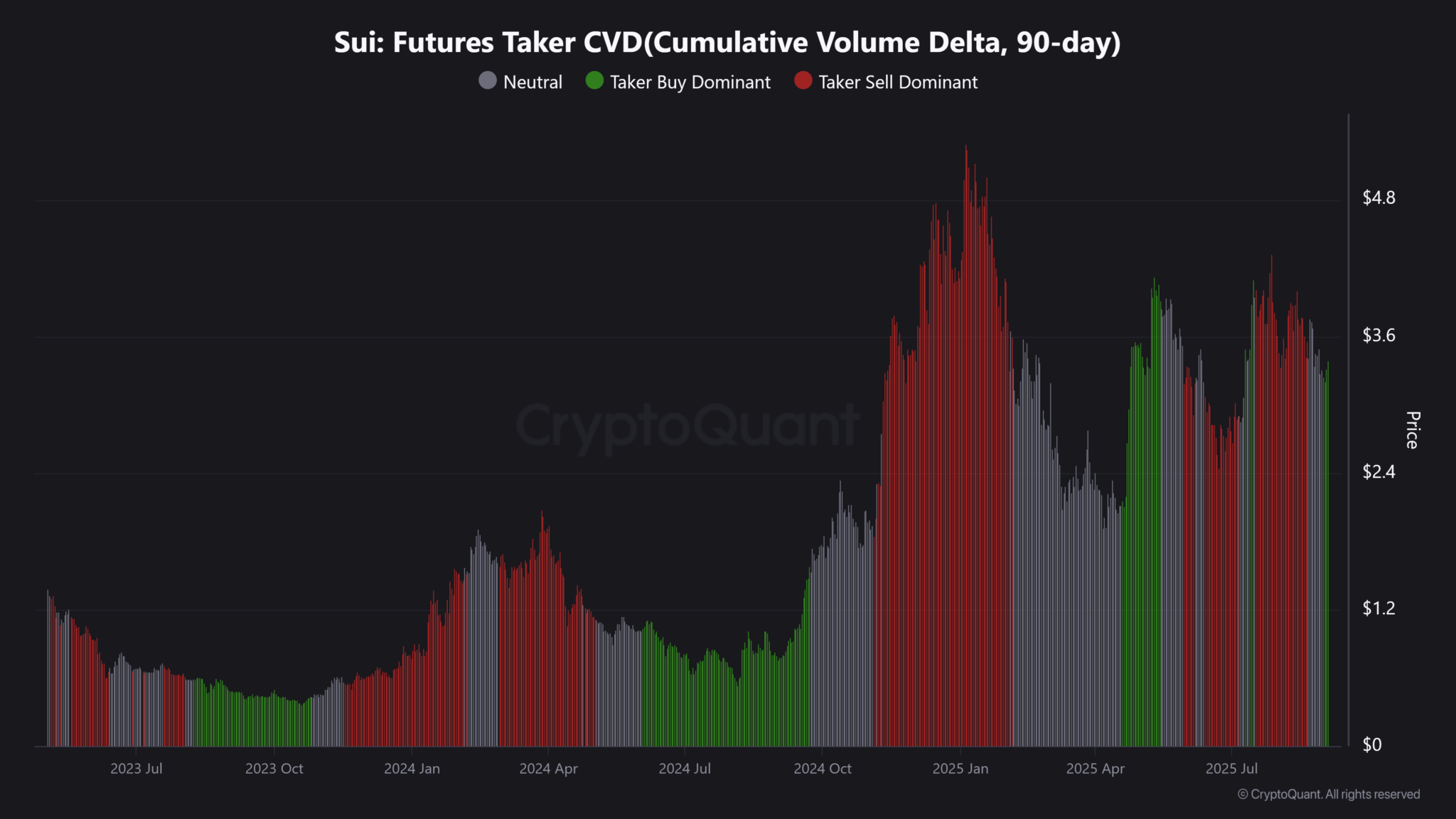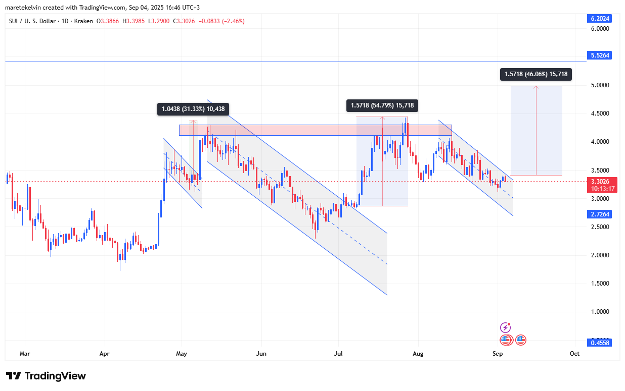 Khi quan sát các biểu đồ ngày của SUI, chúng ta có thể thấy rõ rằng diễn biến giá của altcoin này thường có xu hướng tuần tự. Giá thường trải qua giai đoạn tích lũy, chủ yếu trong các mô hình cờ tăng, trước khi xảy ra một cú bứt phá. Kể từ lần bứt phá gần nhất hồi đầu tháng 7, giá token lại một lần nữa đi vào giai đoạn tích lũy theo mô hình cờ.
