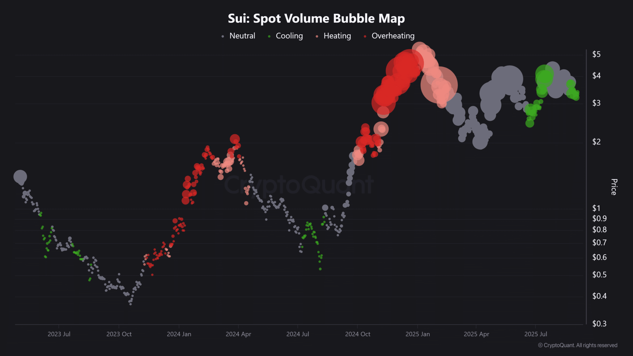 Dựa trên biểu đồ Spot Volume Bubble Map của CryptoQuant, các nhà phân tích nhận thấy rằng điều kiện giao dịch trên thị trường giao ngay đang có dấu hiệu hạ nhiệt. Điều này gợi ý rằng nhiều nhà đầu tư có thể đang chọn cách giữ vị thế an toàn, chờ đợi những tín hiệu rõ ràng hơn về hướng đi của thị trường.