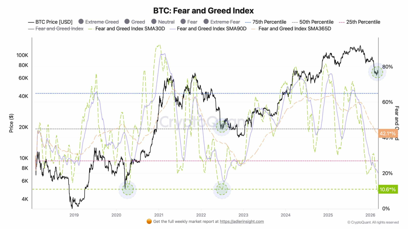 Trong một bài đăng trên X, nhà phân tích tiền điện tử Axel Adler Jr cho biết chỉ số Tham lam và Sợ hãi Crypto trung bình 30 ngày đã giảm xuống còn 10%. Mức này phản ánh trạng thái bi quan cực độ của thị trường, tương tự những giai đoạn khủng hoảng trước đây như cú sụp đổ do đại dịch COVID-19 hay sự kiện Terra LUNA năm 2022.