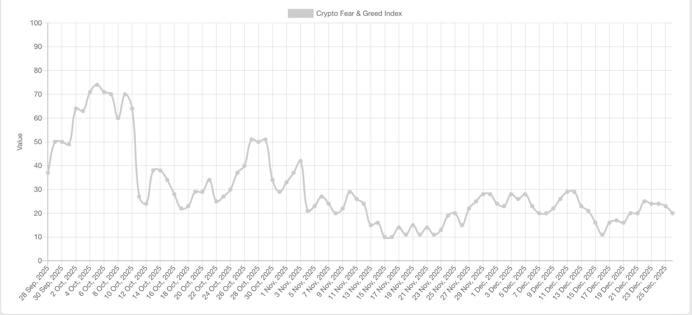 Tâm lý thị trường crypto đã chìm sâu trong sắc đỏ suốt hai tháng qua. Chỉ số Tham lam và Sợ hãi (Fear & Greed) đã dành hơn 30% thời gian của năm 2025 trong vùng “sợ hãi” hoặc “sợ hãi cực độ”, trong khi các thước đo thay thế khác cho thấy thị trường chỉ dao động quanh 10–25 điểm trên thang 100 kể từ giữa tháng 11.