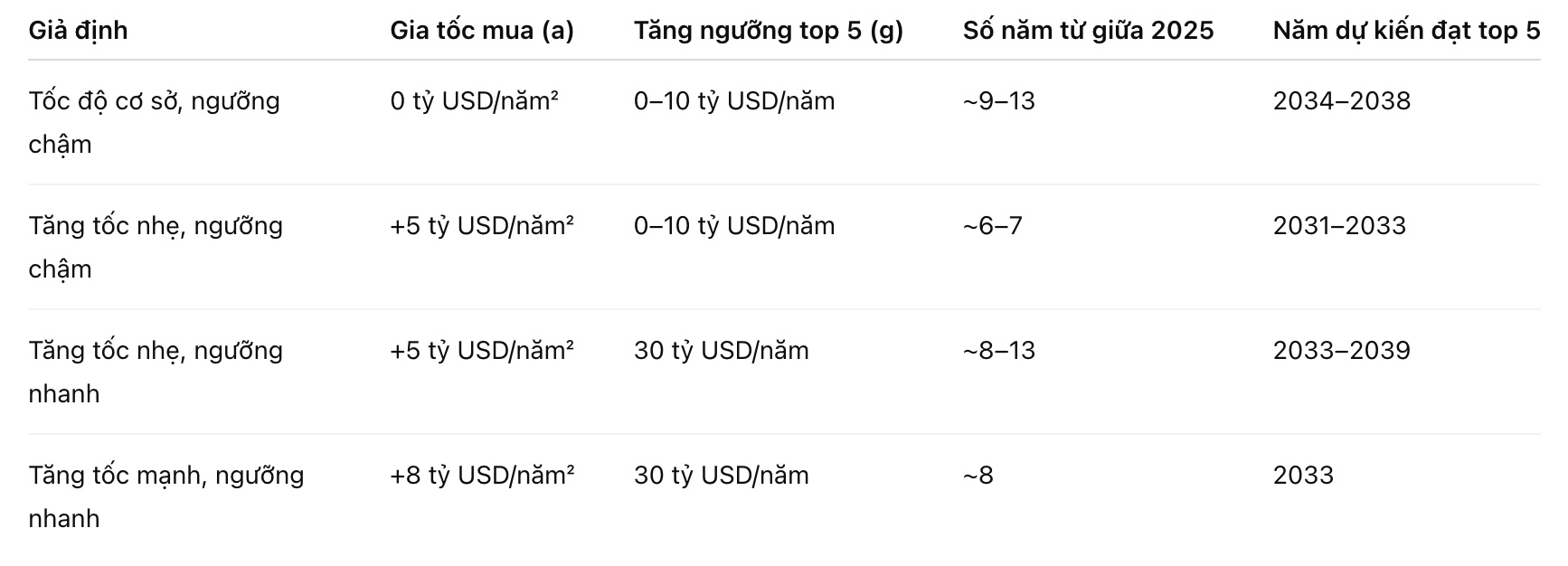Với kịch bản tăng tốc vừa phải (+5 tỷ USD/năm²), thời điểm này có thể rơi vào cuối thập niên 2030 đến giữa 2040. Nếu tăng tốc mạnh hơn (+8 tỷ USD/năm²), mục tiêu có thể đạt được sớm hơn vài năm.