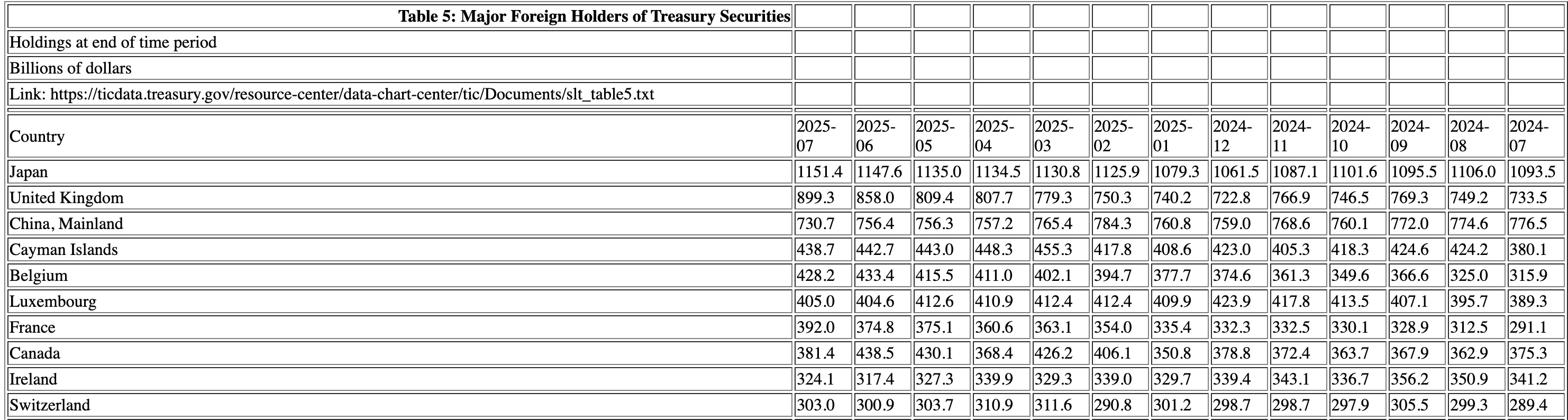 Bảng xếp hạng tháng 7/2025 của Bộ Tài chính Mỹ cho thấy Nhật Bản đang dẫn đầu với khoảng 1,15 nghìn tỷ USD, trong khi Bỉ — quốc gia đứng thứ 5 — nắm khoảng 428 tỷ USD (một phần là tài sản lưu ký thay mặt cho nhà đầu tư quốc tế, biến động mạnh theo tháng).