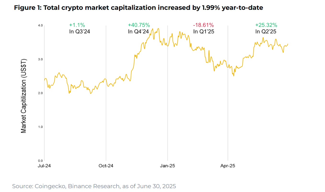 Tuy nhiên, thị trường đã nhanh chóng phục hồi mạnh mẽ trong Quý 2, với mức tăng trưởng 25,32%. Sự phục hồi này không chỉ bù đắp hoàn toàn mức giảm trong quý trước mà còn giúp tái tạo niềm tin và hy vọng trong cộng đồng crypto.