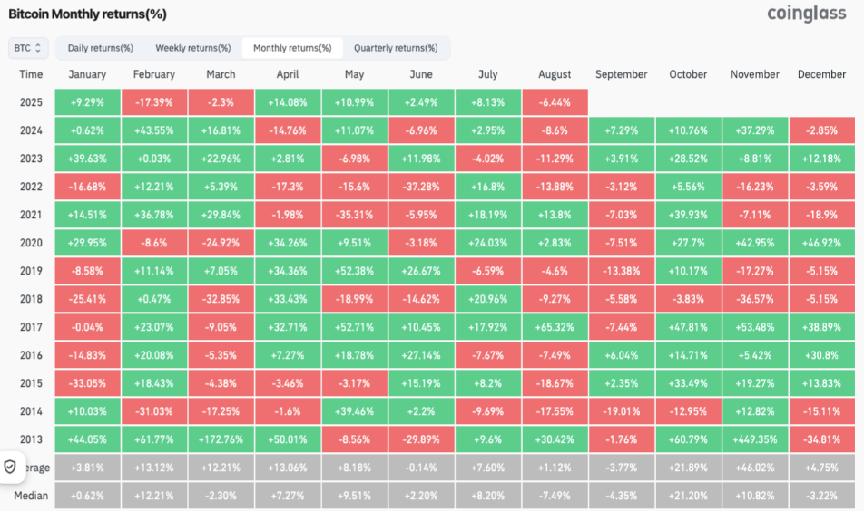 Theo dữ liệu từ CoinGlass, tính đến thời điểm viết bài, BTC/USD đã giảm khoảng 6,5% trong tháng 8 — song vẫn thể hiện kết quả tích cực hơn nhiều so với cùng kỳ bốn năm trước.