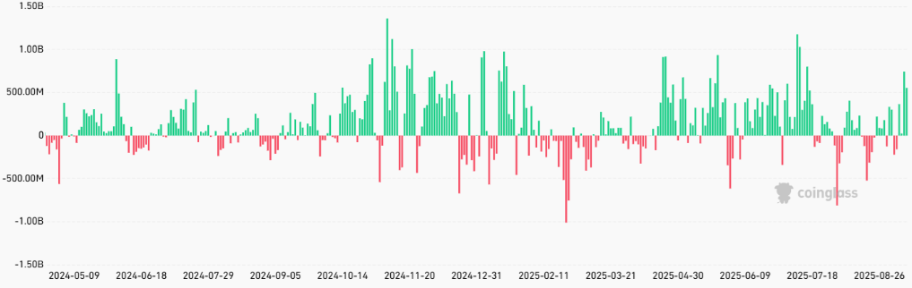 Ở phía ETF, các quỹ Bitcoin giao ngay tại Mỹ đã ghi nhận 1,3 tỷ USD dòng vốn vào chỉ trong hai ngày 11–12/9, nâng tổng tài sản được quản lý (AUM) lên 148 tỷ USD. Dẫn đầu là iShares Bitcoin Trust (IBIT) với 87,5 tỷ USD, theo sau là Fidelity Wise Origin Bitcoin Fund (FBTC) với 23 tỷ USD và Grayscale Bitcoin Trust (GBTC) với 20,6 tỷ USD.