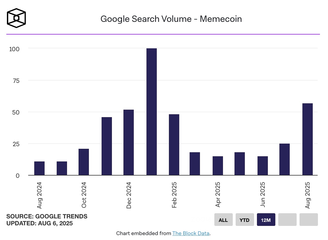 Lượng tìm kiếm Google cho từ khóa “memecoin” đã tăng trở lại mức 57 sau nhiều tháng trầm lắng, cho thấy sự quan tâm mới từ nhà đầu tư cá nhân. Tuy nhiên, con số này vẫn thấp hơn nhiều so với đỉnh điểm 100 vào tháng 1, khi cơn sốt memecoin TRUMP bùng nổ. Chỉ số này đo lường mức độ quan tâm tìm kiếm theo thang 0-100, với 100 là mức cao nhất trong khung thời gian nhất định, được xem như thước đo phản ánh mức độ tham gia của nhà đầu tư phổ thông vào các tài sản tiền điện tử mang tính đầu cơ.