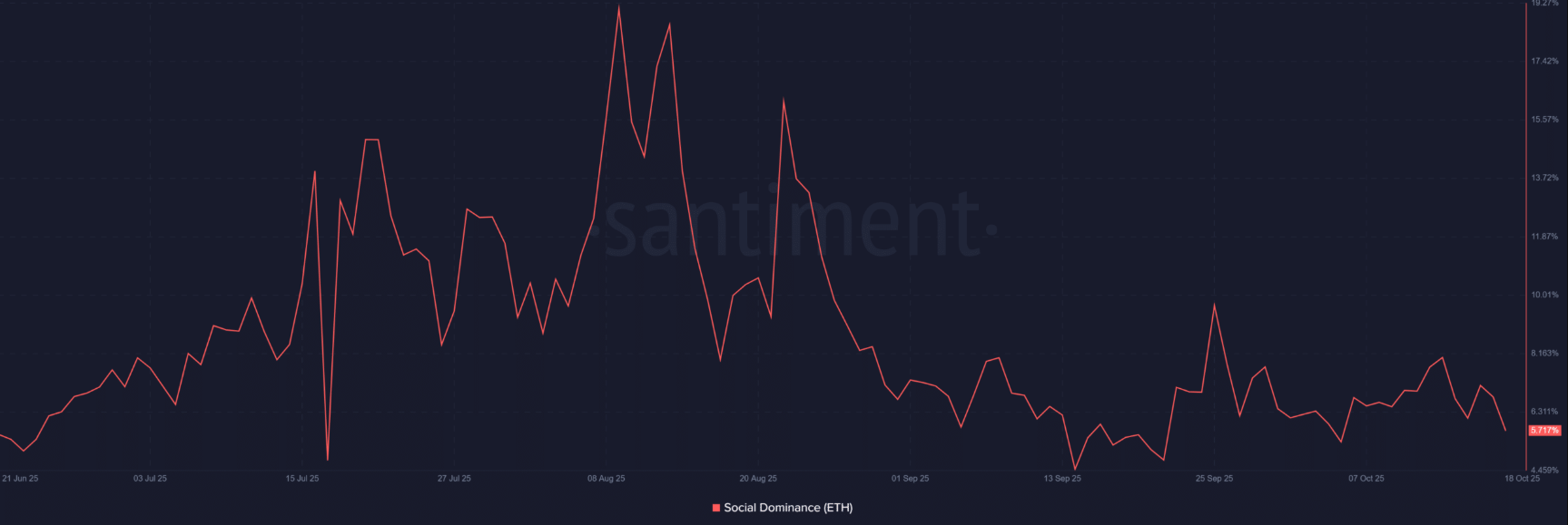 Tại thời điểm viết bài, Social Dominance của Ethereum đã giảm xuống còn 5,17%, phản ánh sự hạ nhiệt trong các cuộc thảo luận về ETH, dù giá vừa có một đợt phục hồi ngắn.