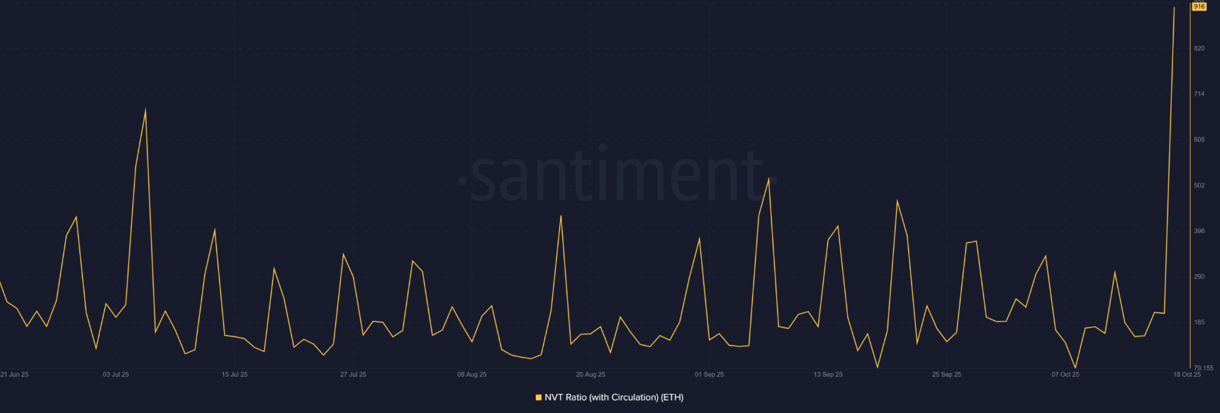 Tỷ lệ NVT (Network Value to Transactions) của Ethereum vừa bứt phá lên mức 916, cho thấy giá trị thị trường của ETH đang mở rộng nhanh hơn nhiều so với mức độ hoạt động thực tế trên mạng lưới.