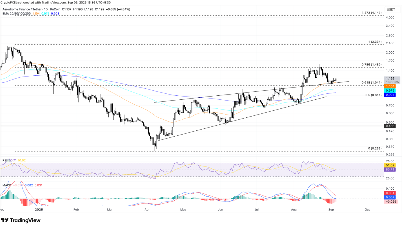 Trong phiên giao dịch thứ Sáu, AERO đã ghi nhận mức tăng hơn 4%, giữ vững trên ngưỡng Fibonacci thoái lui 61,8%, được xác định từ mức cao 2,33 USD vào ngày 12/12 đến mức thấp 0,28 USD vào ngày 7/4, hiện ở mức 1,04 USD. Đà hồi phục đang hướng tới ngưỡng Fibonacci thoái lui 78,6% tại 1,48 USD, với đường EMA 50 ngày đóng vai trò là hỗ trợ động, tạo điều kiện thuận lợi cho xu hướng tăng tiếp diễn.