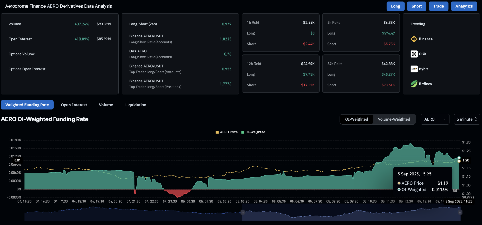 Dữ liệu từ CoinGlass cho thấy hợp đồng mở (OI) của AERO đã tăng hơn 10% chỉ trong 24 giờ, chạm mốc 85,92 triệu USD. Sự bùng nổ dòng vốn này, đẩy mạnh hoạt động của các vị thế hợp đồng tương lai và quyền chọn AERO, phản ánh rõ ràng tâm lý “risk-on” đang lan tỏa mạnh mẽ trong cộng đồng trader phái sinh.