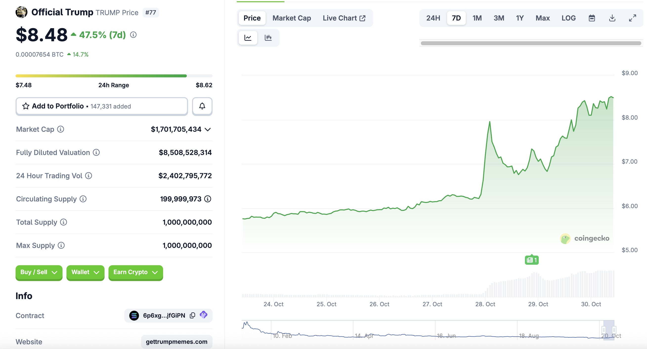 Biểu đồ giá TRUMP trong 7 ngày qua | Nguồn: CoinGecko