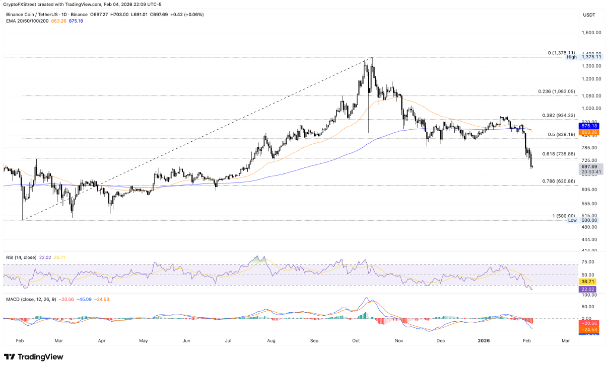 Về mặt kỹ thuật, vùng hỗ trợ gần nhất của BNB nằm tại mức Fibonacci thoái lui 78,6% quanh 620 USD, được đo từ đáy tháng 2/2025 ở 500 USD đến đỉnh tháng 10/2025 tại 1.375 USD. Nếu mốc hỗ trợ then chốt này bị xuyên thủng một cách dứt khoát, kịch bản giá tiếp tục lao dốc sẽ trở nên rõ ràng hơn.