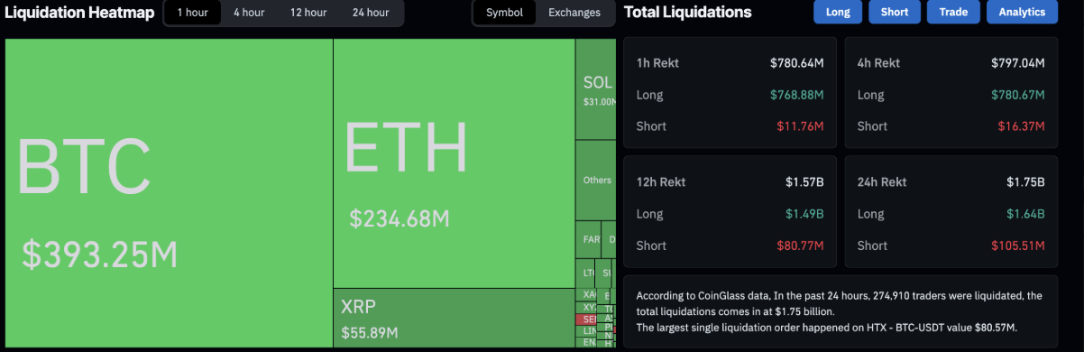 Trên bình diện toàn thị trường, cú điều chỉnh bất ngờ của Bitcoin đã kích hoạt làn sóng bán tháo diện rộng, khiến hơn 1,75 tỷ USD bị thanh lý chỉ trong 24 giờ qua, ảnh hưởng tới 274.910 nhà giao dịch. Đáng chú ý, các vị thế mua (Long) chiếm tới hơn 1,64 tỷ USD, trong khi vụ thanh lý lớn nhất ghi nhận trên sàn HTX, cặp BTC-USDT, với giá trị lên tới 80,57 triệu USD.