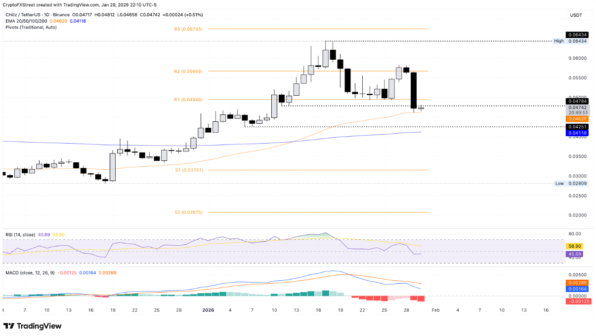 Một cái tên khác chịu áp lực bán đáng kể là Chiliz (CHZ). Trong phiên giao dịch ngày thứ Sáu, CHZ lình xình quanh đường EMA 50 ngày tại 0,0462 USD, sau khi lao dốc tới 16% ở phiên trước đó. Đáng chú ý, cây nến giảm dạng Marubozu hình thành trong phiên thứ Năm đã xuyên thủng mốc tâm lý 0,0500 USD, qua đó củng cố rõ rệt xu hướng tiêu cực của giá.