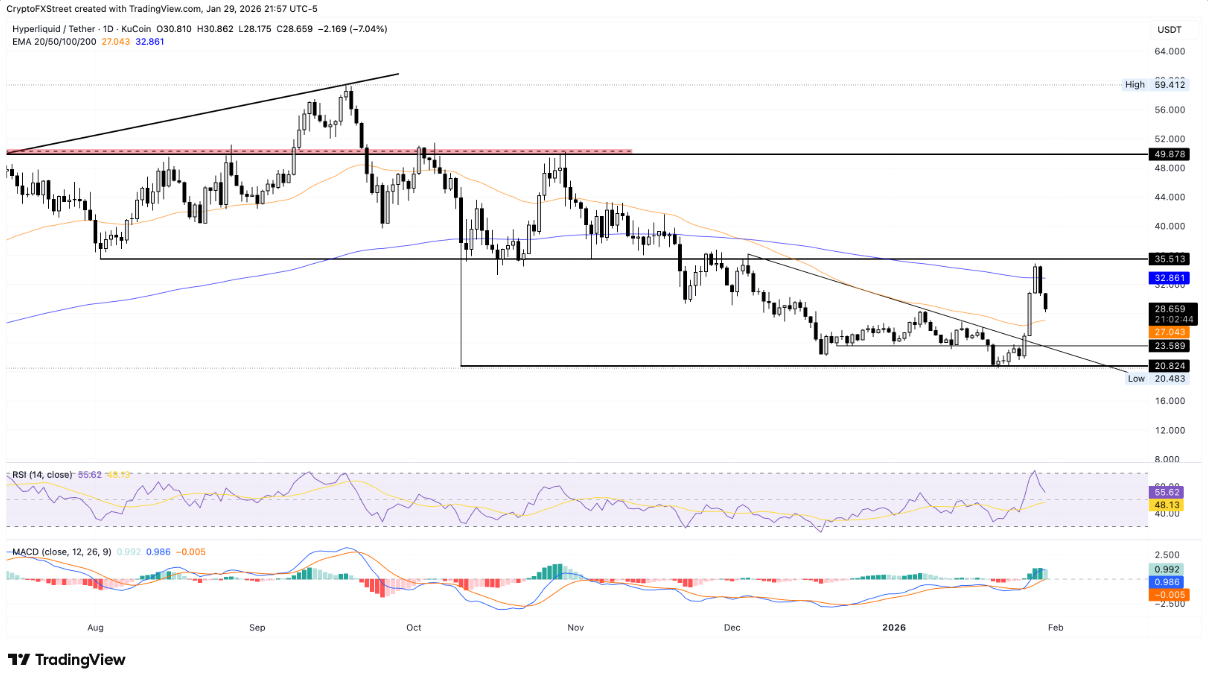 Ngược lại, nếu HYPE đóng cửa dưới EMA 50 ngày tại 27,04 USD, rủi ro điều chỉnh sâu hơn sẽ gia tăng, với mục tiêu tiếp theo là mốc 23,58 USD – đáy được thiết lập vào ngày 21/12.