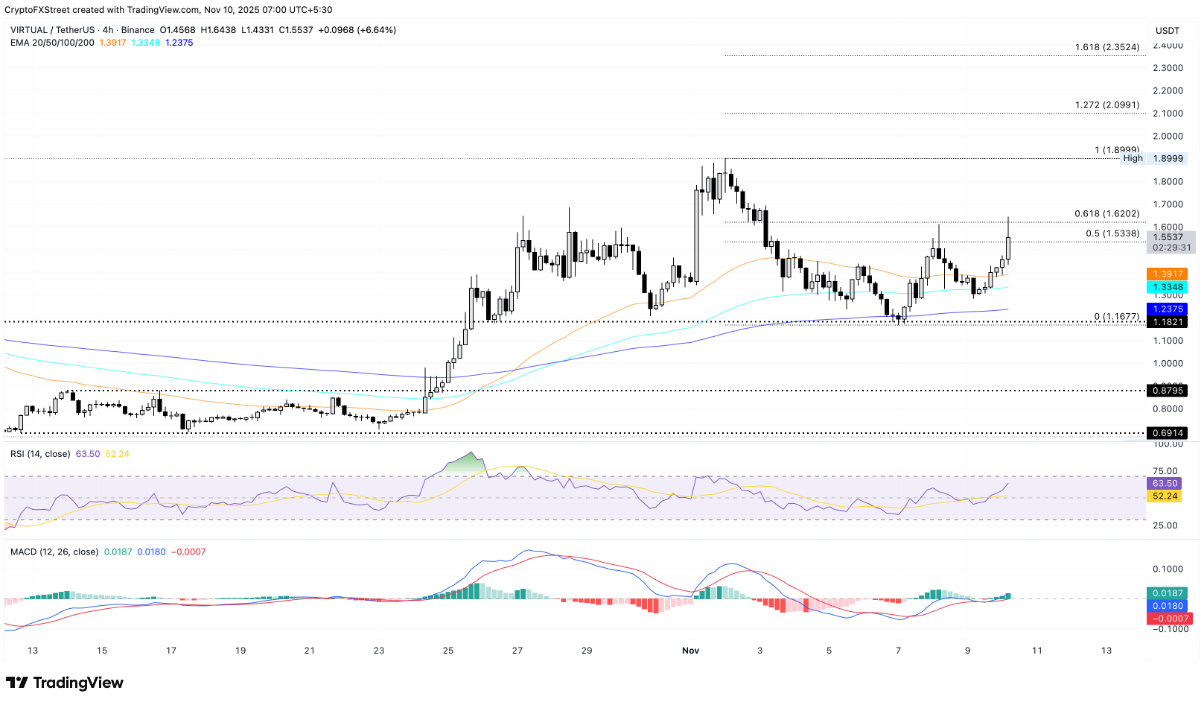 Virtuals Protocol (VIRTUAL) tăng 7% tại thời điểm viết bài hôm thứ Hai, nối tiếp mức tăng 6% của ngày Chủ nhật. Token của mạng lưới AI Agents hiện đang thử thách mức Fibonacci thoái lui 61,8% tại $1,62, được tính từ đỉnh $1,89 vào ngày 2/11 đến đáy $1,16 vào ngày 7/11 trên khung 4 giờ.