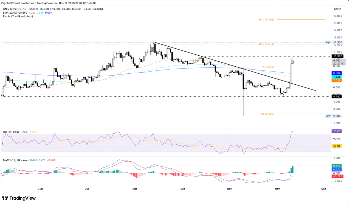 Trên thị trường, UNI đang duy trì chuỗi tăng ấn tượng 5 ngày liên tiếp, tiến sát vùng tâm lý quan trọng 10 USD. Tại thời điểm viết bài, UNI tăng 4% trong ngày thứ Ba, nối tiếp đà bứt phá 42% hôm thứ Hai. Nếu giá đóng cửa vượt đỉnh ngày 13/9 ở mức 10,36 USD, token của sàn giao dịch phi tập trung (DEX) này có thể mở rộng xu hướng tăng lên mốc R2 Pivot Point tại 12,04 USD.