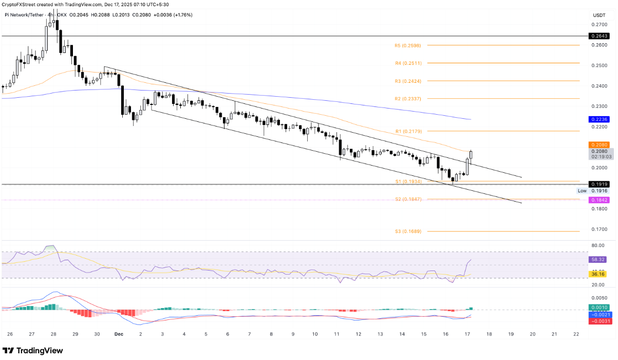 Pi Network ghi nhận mức tăng nhẹ gần 2% trong phiên giao dịch ngày thứ Tư, qua đó lấy lại mốc tâm lý quan trọng $0,2000. Đáng chú ý, token PI đã bứt phá thành công khỏi mô hình kênh giảm trên biểu đồ 4 giờ — cấu trúc được hình thành bởi hai đường xu hướng song song dốc xuống, cho thấy tín hiệu suy yếu của xu hướng giảm trước đó.