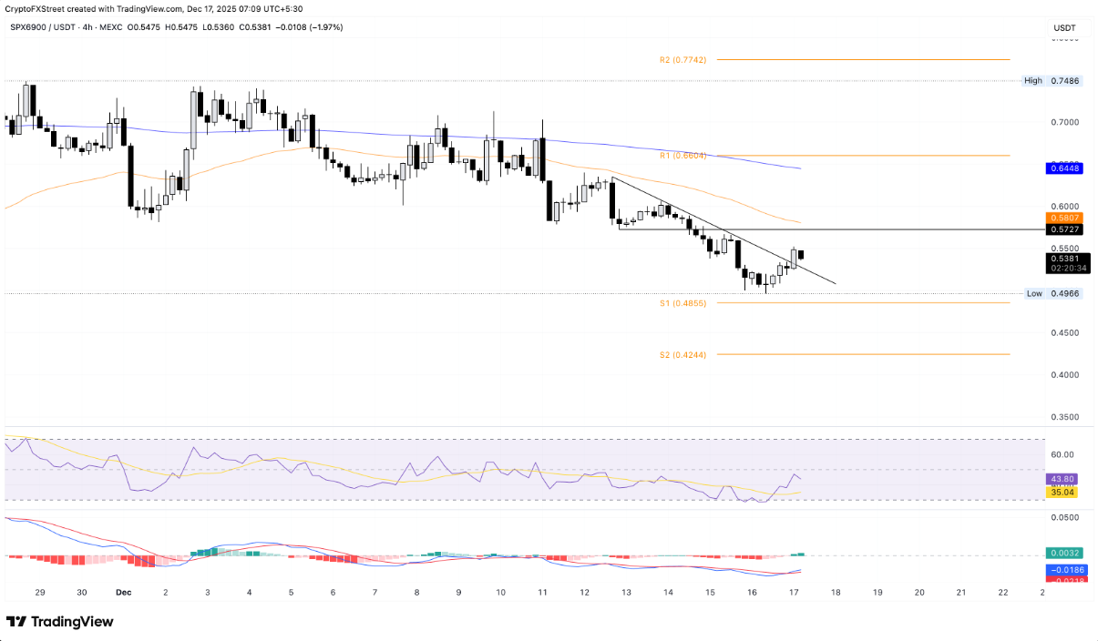 SPX6900 đã có cú bứt phá đáng chú ý khi vượt lên trên đường kháng cự cục bộ trên khung thời gian 4 giờ, sau mức tăng 5% trong phiên thứ Ba. Đà tăng này giúp giá duy trì vững vàng trên ngưỡng tâm lý quan trọng $0,50. Tuy nhiên, sang phiên thứ Tư, đà hưng phấn có dấu hiệu chững lại khi SPX gặp lực cản đáng kể quanh vùng $0,5500 và chưa thể xác lập một pha bứt phá dứt khoát.