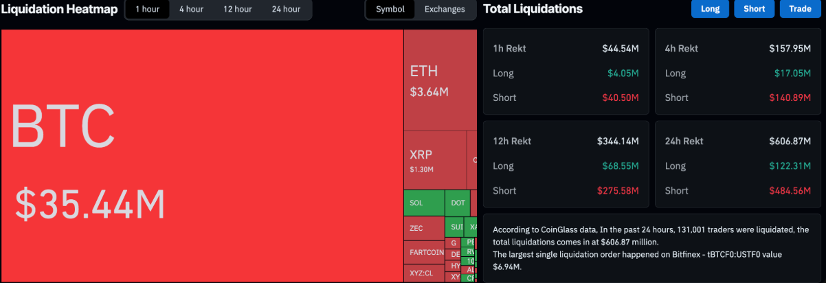 Đà tăng mạnh này đã kích hoạt làn sóng thanh lý quy mô lớn, cuốn trôi khoảng 131.000 trader với tổng giá trị lên tới 606 triệu USD trong vòng 24 giờ, trong đó phần lớn – khoảng 484 triệu USD – đến từ các vị thế short.