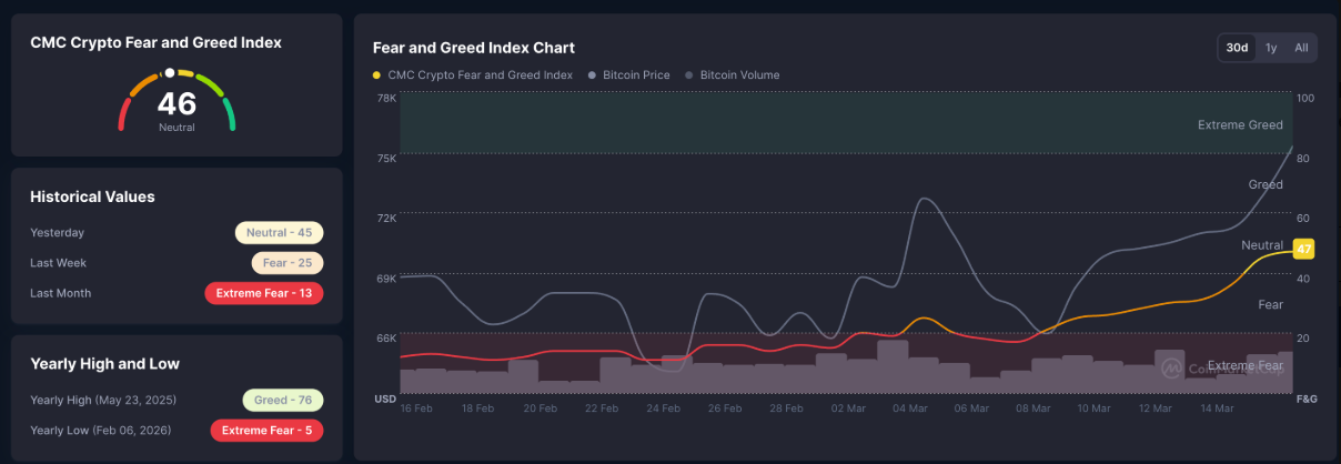 Tâm lý thị trường cũng cải thiện khi chỉ số Fear & Greed của CoinMarketCap tăng lên 46, cho thấy trạng thái trung lập đang dần được thiết lập trở lại.