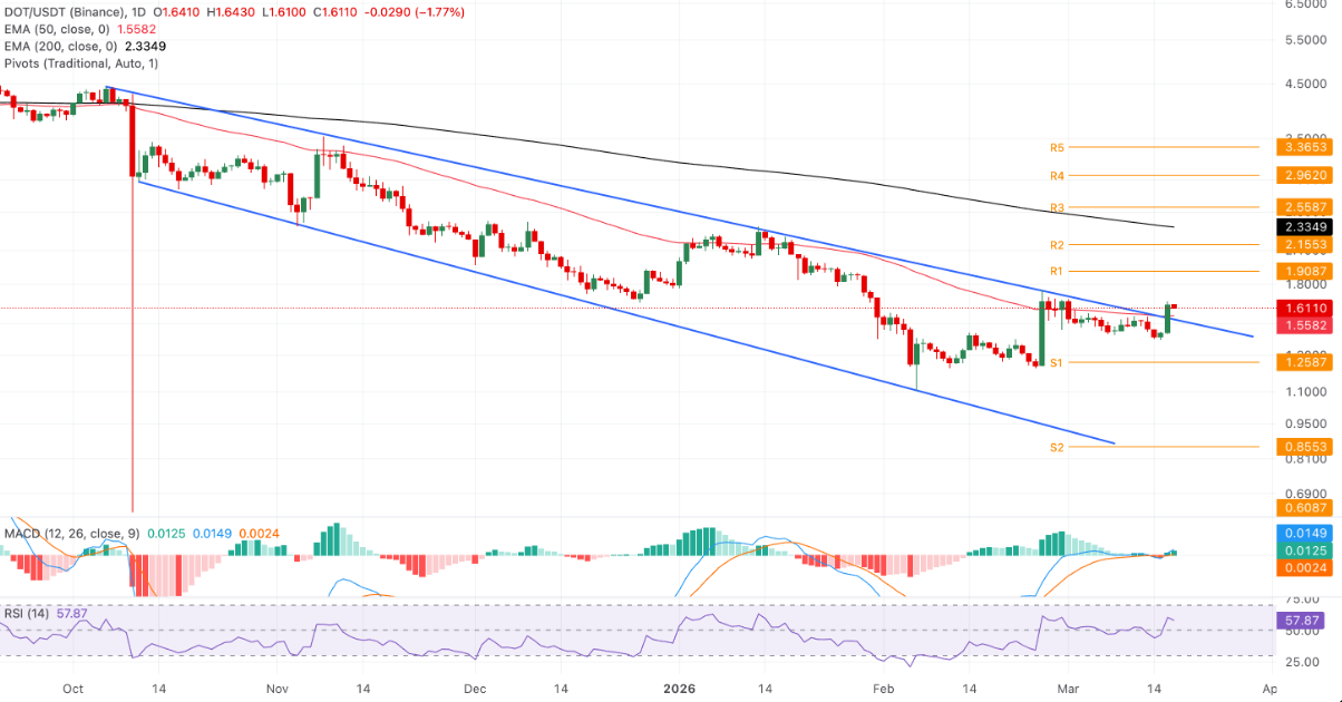 Trong kịch bản tích cực, DOT có thể hướng tới vùng kháng cự Pivot R1 tại 1,90 USD, trước khi thử thách mốc tâm lý 2,00 USD. Ngược lại, nếu giá suy yếu và phá vỡ xuống dưới EMA 50 ngày tại 1,55 USD, áp lực điều chỉnh có thể kéo giá lùi về khu vực trendline quanh 1,50 USD, qua đó làm suy yếu tín hiệu bứt phá trước đó.
