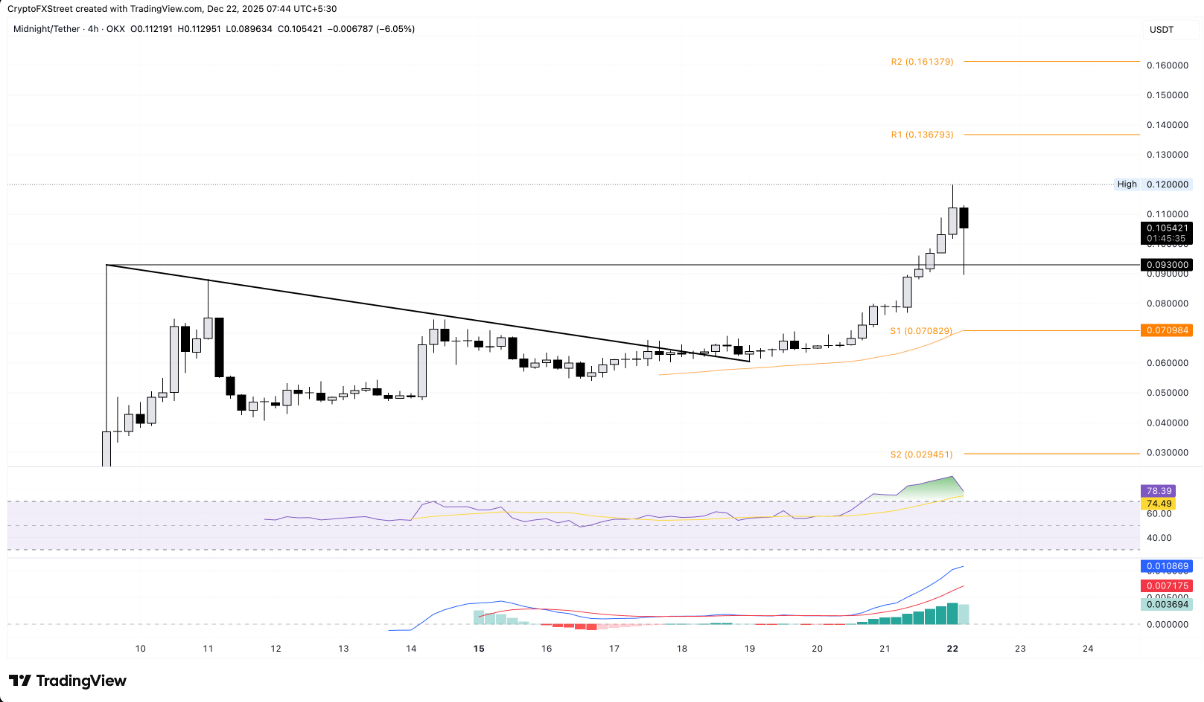 Midnight – sidechain tập trung vào quyền riêng tư của Cardano – ghi nhận mức điều chỉnh khoảng 6% tại thời điểm viết bài trong ngày thứ Hai, sau khi bứt phá mạnh mẽ 42% ở phiên trước đó. Đà tăng của token NIGHT được thúc đẩy bởi những tiến triển tích cực của mạng lưới, khi testnet đã vận hành và tạo ra hơn 3 triệu block, phản ánh mức độ hoạt động ngày càng gia tăng.
