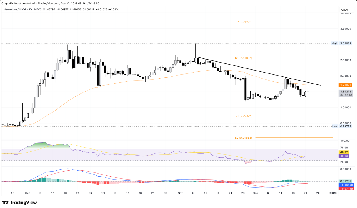 MemeCore đang giao dịch quanh vùng 1,50 USD tại thời điểm viết bài ngày thứ Hai, với mục tiêu trước mắt là thử thách đường EMA 50 ngày tại 1,70 USD. Đà tăng 10% trong ngày Chủ nhật đã giúp token M tránh được kịch bản lao dốc sâu về mốc tâm lý 1,00 USD, qua đó tạm thời ổn định cấu trúc giá ngắn hạn.