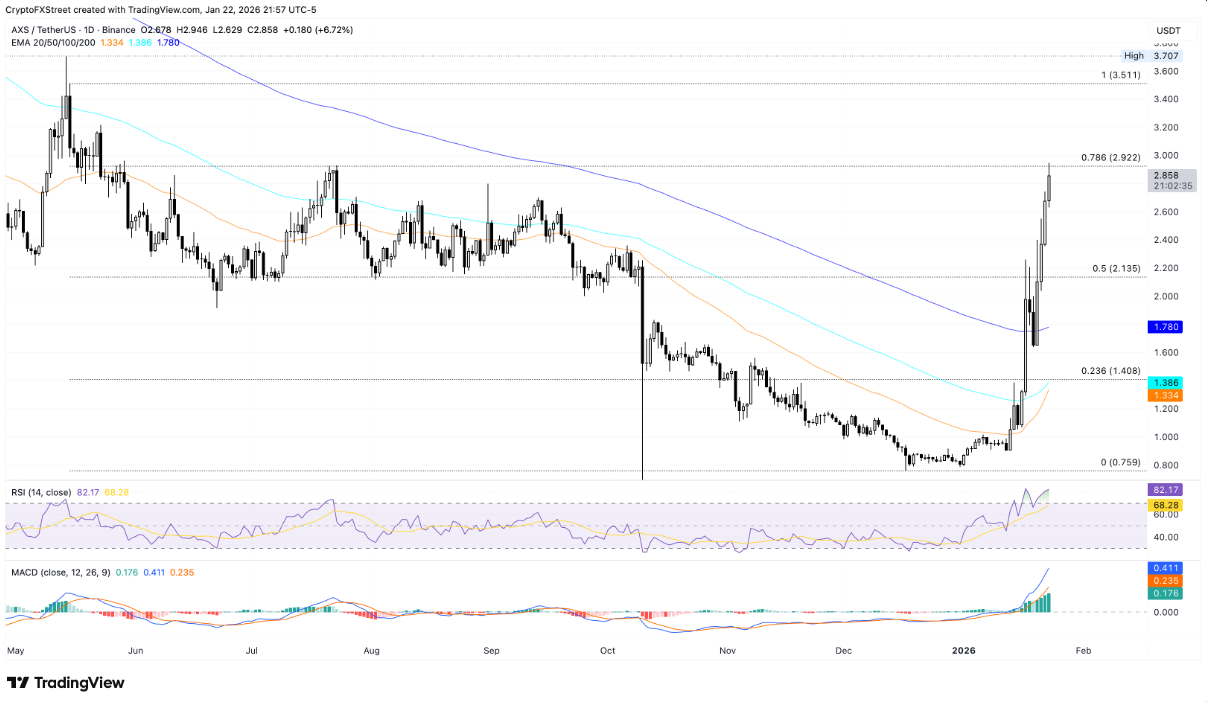 Axie Infinity (AXS) đã bứt phá mạnh mẽ trong tháng này, ghi nhận mức tăng ấn tượng hơn 250% và tiến sát ngưỡng $3. Tại thời điểm viết bài, AXS đang tăng gần 7% trong phiên thứ Sáu, nhưng đang đối mặt sức cản quan trọng tại mức Fibonacci thoái lui 78,6% ở $2,92, được tính từ đỉnh ngày 15/5 ($3,51) xuống đáy ngày 17/12 ($0,75).