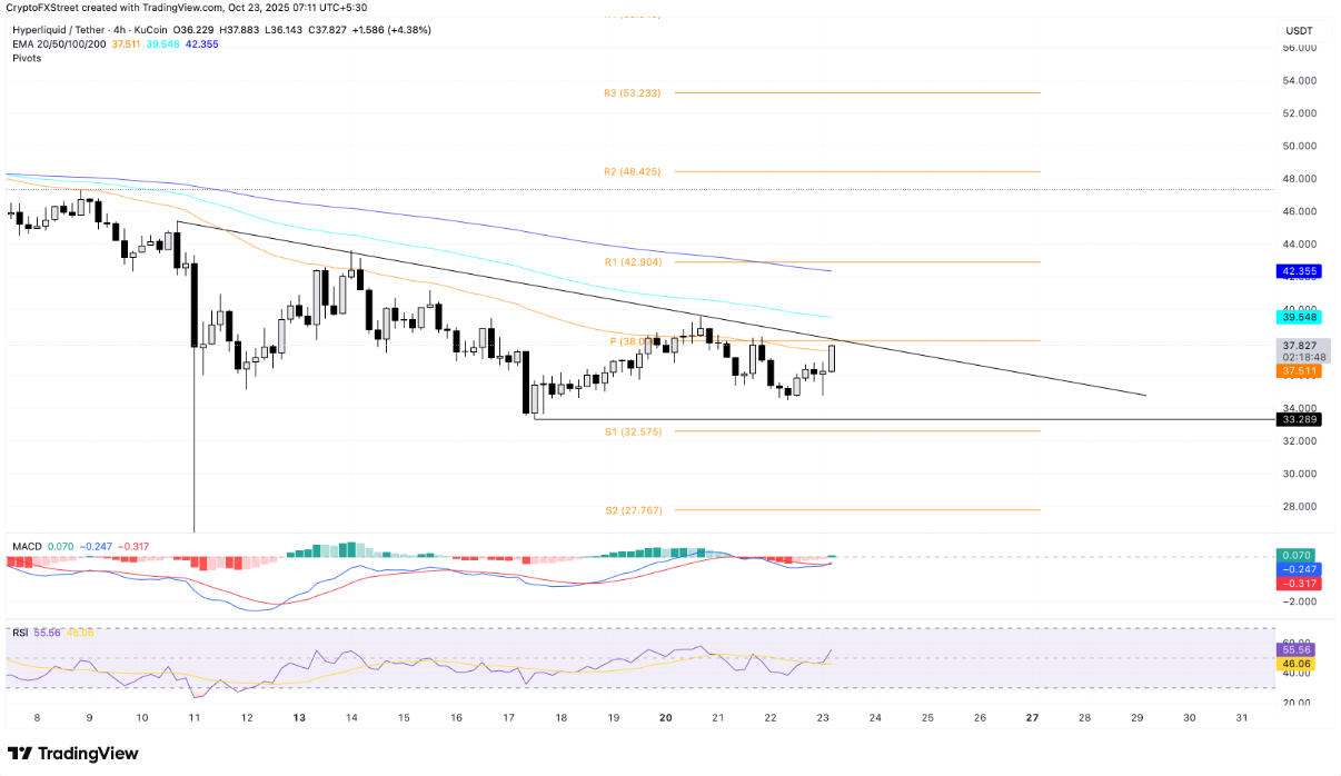 Tính đến thời điểm viết bài vào thứ Năm, giá Hyperliquid (HYPE) đã tăng hơn 4%, nối tiếp đà đi lên 2% của ngày hôm trước. Động lực phục hồi của token thuộc sàn giao dịch phi tập trung (DEX) chuyên về hợp đồng vĩnh viễn này đang đưa giá tiến sát vùng kháng cự cục bộ, hình thành mô hình tam giác giảm với đường cơ sở tại 33,28 USD — trùng với mức đáy được ghi nhận hôm thứ Sáu trên khung 4 giờ.