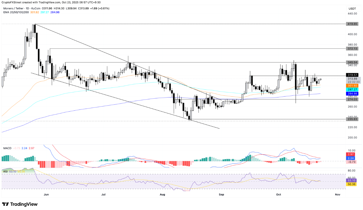 Tuy nhiên, nếu bị từ chối tại vùng 319 USD, XMR có thể lùi về kiểm tra các vùng hỗ trợ kỹ thuật quan trọng, gồm đường EMA 50 ngày tại 302 USD, EMA 100 ngày tại 297 USD và EMA 200 ngày tại 285 USD.