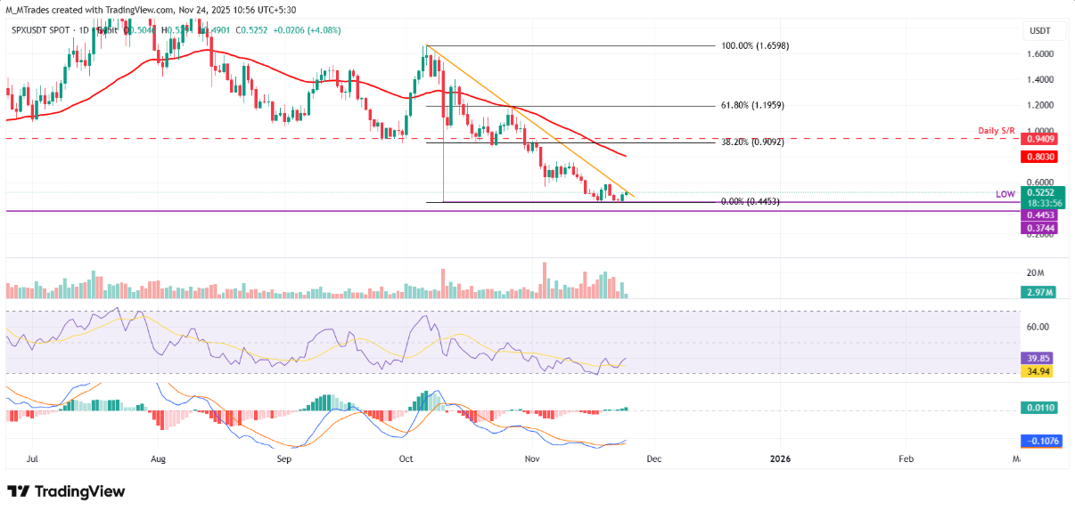 Giá SPX6900 đã trở lại kiểm tra vùng đáy ngày 10/10 tại 0,445 USD vào thứ Bảy, trước khi bật tăng mạnh 9,5% trong ngày tiếp theo. Tại thời điểm viết bài vào thứ Hai, đồng coin này tiếp tục mở rộng đà phục hồi, tiến gần tới đường xu hướng giảm quanh 0,525 USD.