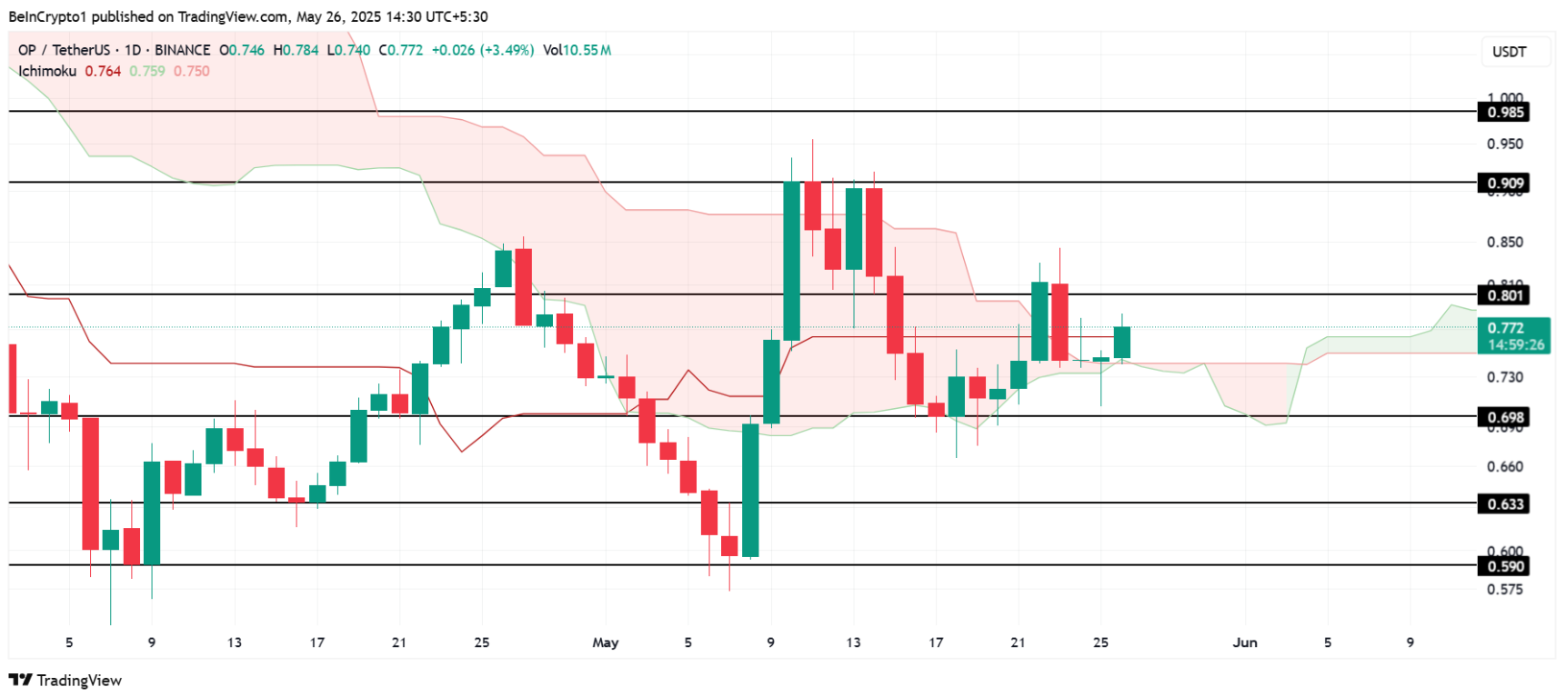 Hiện tại, OP đang giao dịch bên trên đám mây của chỉ báo Ichimoku Cloud — một tín hiệu kỹ thuật cho thấy lực cầu đang hình thành và xu hướng tăng có thể đang tích lũy. Nếu duy trì được đà hiện tại, OP hoàn toàn có khả năng phá vỡ ngưỡng kháng cự then chốt tại $0,80 và tiến tới vùng giá $0,90, từ đó thu hút thêm dòng tiền đầu cơ và đầu tư mới.