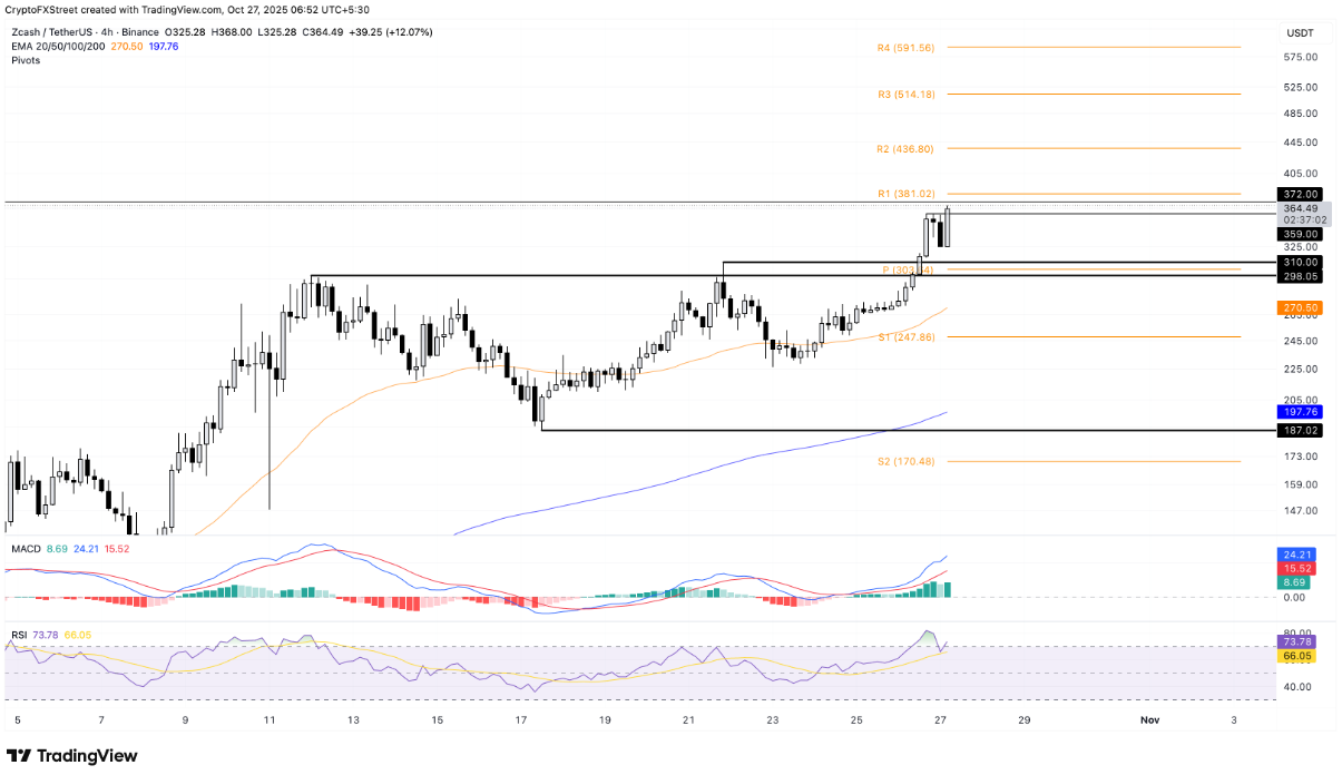Tính đến thời điểm viết bài vào thứ Hai, Zcash (ZEC) ghi nhận mức tăng 12%, nối tiếp đà bứt phá 17% trong ngày Chủ nhật. Với chuỗi năm phiên tăng liên tiếp, đồng coin ẩn danh này đang tiến gần vùng đỉnh lịch sử 372 USD và ngưỡng kháng cự R1 Pivot Point tại 381 USD — hai mốc được xem là rào cản kỹ thuật quan trọng trên biểu đồ 4 giờ.