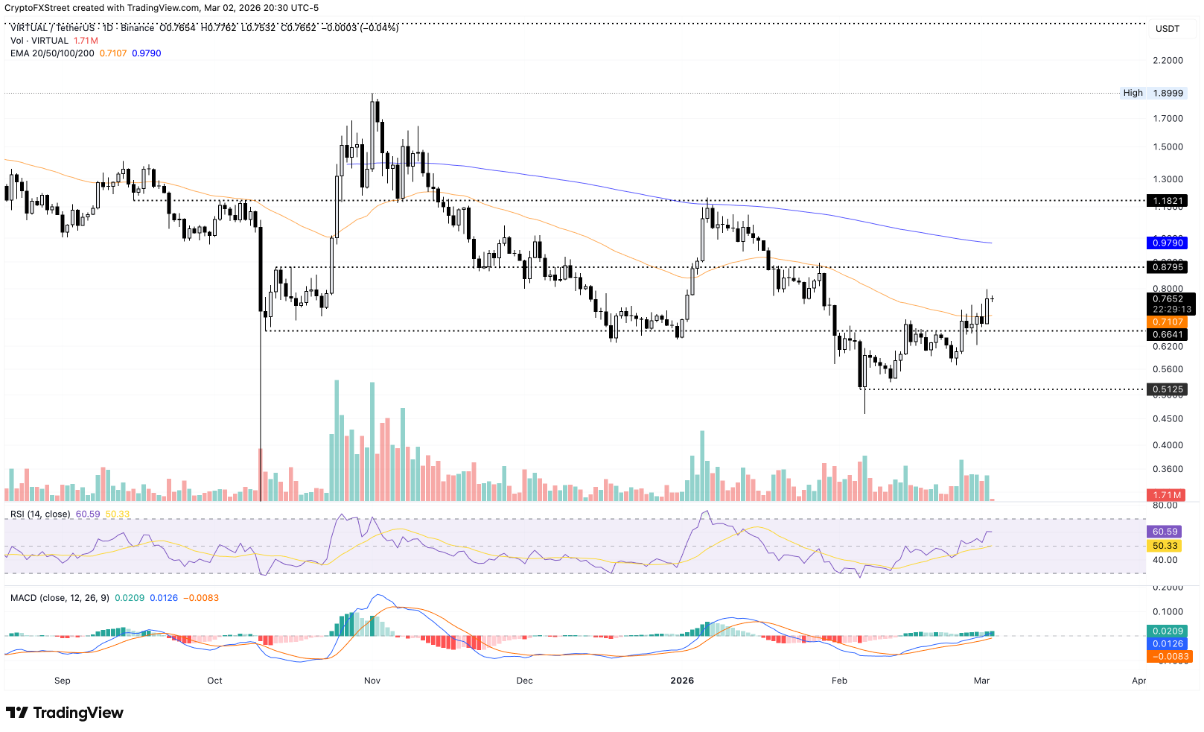 Virtuals Protocol (VIRTUAL) bứt phá mạnh mẽ khi tăng 11% trong phiên thứ Hai, qua đó chinh phục thành công đường EMA 50 ngày tại 0,7107 USD – một tín hiệu kỹ thuật cho thấy động lực tăng giá đang được củng cố. Tại thời điểm viết bài, VIRTUAL duy trì giao dịch trên 0,7500 USD và đang hướng tới mốc 0,8795 USD, vùng giá từng được kiểm tra gần nhất vào ngày 28/1.