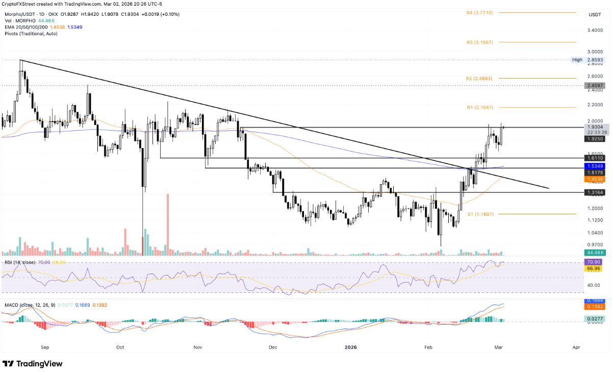 Morpho (MORPHO) giao dịch quanh mốc 1,90 USD trong phiên thứ Ba, nối dài đà hưng phấn sau cú bứt phá hơn 10% ở phiên trước đó. Bức tranh kỹ thuật ngắn hạn đang nghiêng rõ về phe bò khi giá duy trì phía trên cả đường EMA 50 và EMA 200 ngày – hai đường trung bình đều dốc lên, hé lộ khả năng hình thành mô hình Golden cross trong thời gian tới.