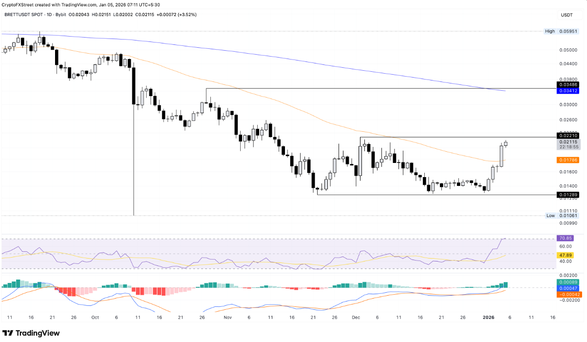 Đà phục hồi kéo dài 5 phiên liên tiếp đã giúp BRETT tăng hơn 50%, cho thấy động lượng tăng giá đang được củng cố rõ rệt. Chỉ số RSI đã vươn lên ngưỡng 70 — vùng quá mua — nhưng vẫn tiếp tục hướng lên, phản ánh lực cầu mạnh mẽ. Việc giá tích lũy đi ngang trong vùng quá mua có thể tạo nền tảng để BRETT tiếp tục leo cao.