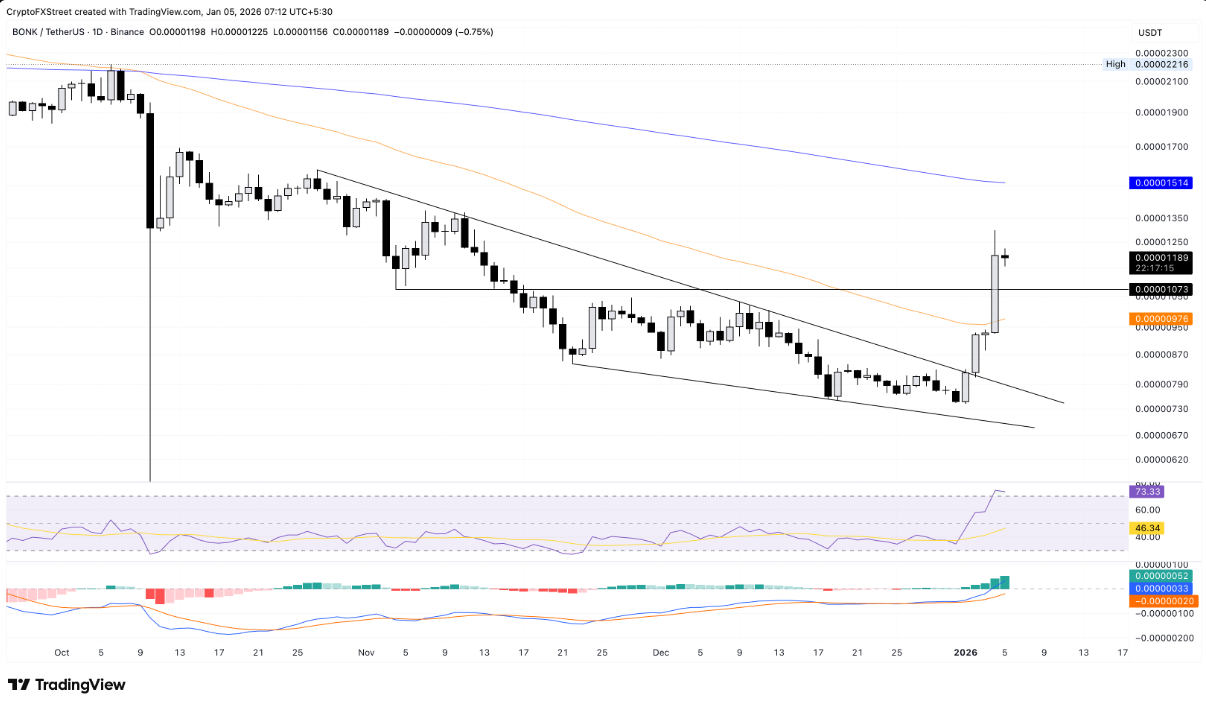 Bonk điều chỉnh nhẹ gần 1% tại thời điểm viết bài vào thứ Hai, sau cú bứt phá mạnh mẽ 28% trong phiên trước đó, qua đó chinh phục thành công mốc tâm lý 0,00001000 USD. Đà tăng liên tiếp suốt bốn ngày của BONK cho thấy tín hiệu bứt phá rõ ràng khỏi mô hình cái nêm giảm, mở ra dư địa tăng trưởng mới, với mục tiêu kế tiếp của phe bò hướng tới đường EMA 200 ngày quanh 0,00001514 USD.