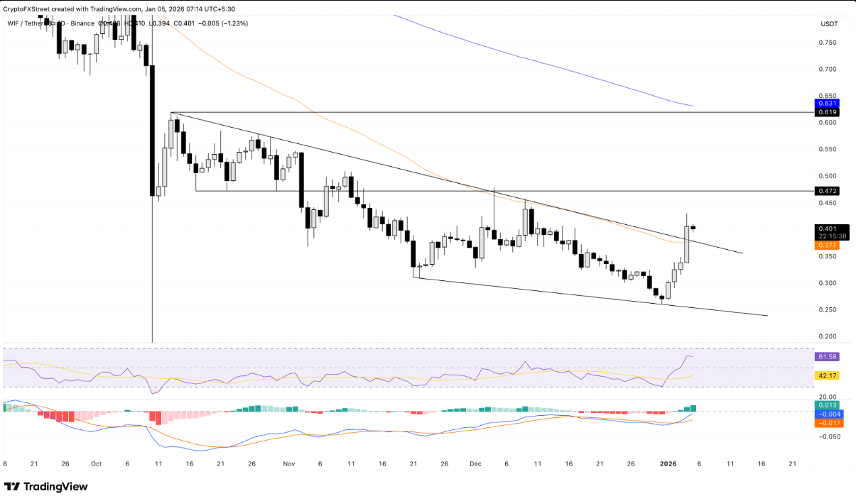 Dogwifhat (WIF) đang giao dịch vững chắc trên ngưỡng 0,40 USD tại thời điểm viết bài vào thứ Hai, đánh dấu chuỗi bốn phiên tăng liên tiếp với mức phục hồi ấn tượng gần 50%. Riêng trong ngày Chủ nhật, meme coin này bứt phá mạnh 20%, không chỉ vượt lên trên đường EMA 50 ngày tại 0,377 USD mà còn phá vỡ đường xu hướng kháng cự hình thành từ các đỉnh ngày 13 và 27/10 — một tín hiệu kỹ thuật mang tính xác nhận xu hướng.