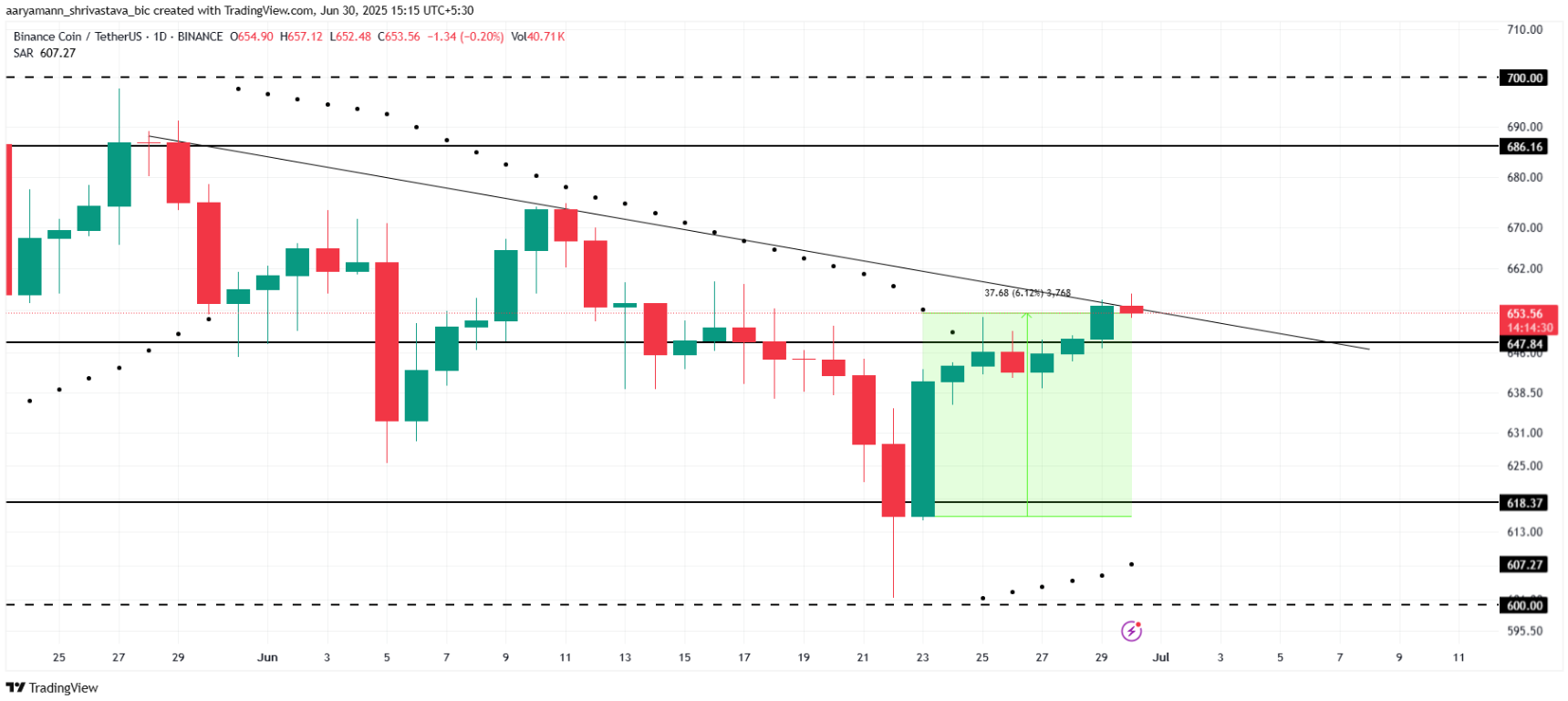 Trên phương diện kỹ thuật, chỉ báo Parabolic SAR hiện đang nằm dưới biểu đồ nến, củng cố tín hiệu tăng giá. Mức kháng cự tiếp theo được xác định tại $686, nhưng để đạt được, BNB cần bảo vệ thành công ngưỡng $647. Trong kịch bản tích cực, việc duy trì mức hỗ trợ này có thể mở đường cho đà tăng tới $686. Ngược lại, nếu thất bại, giá có thể trượt về vùng $618 – đe dọa làm suy yếu xu hướng phục hồi vừa mới hình thành.