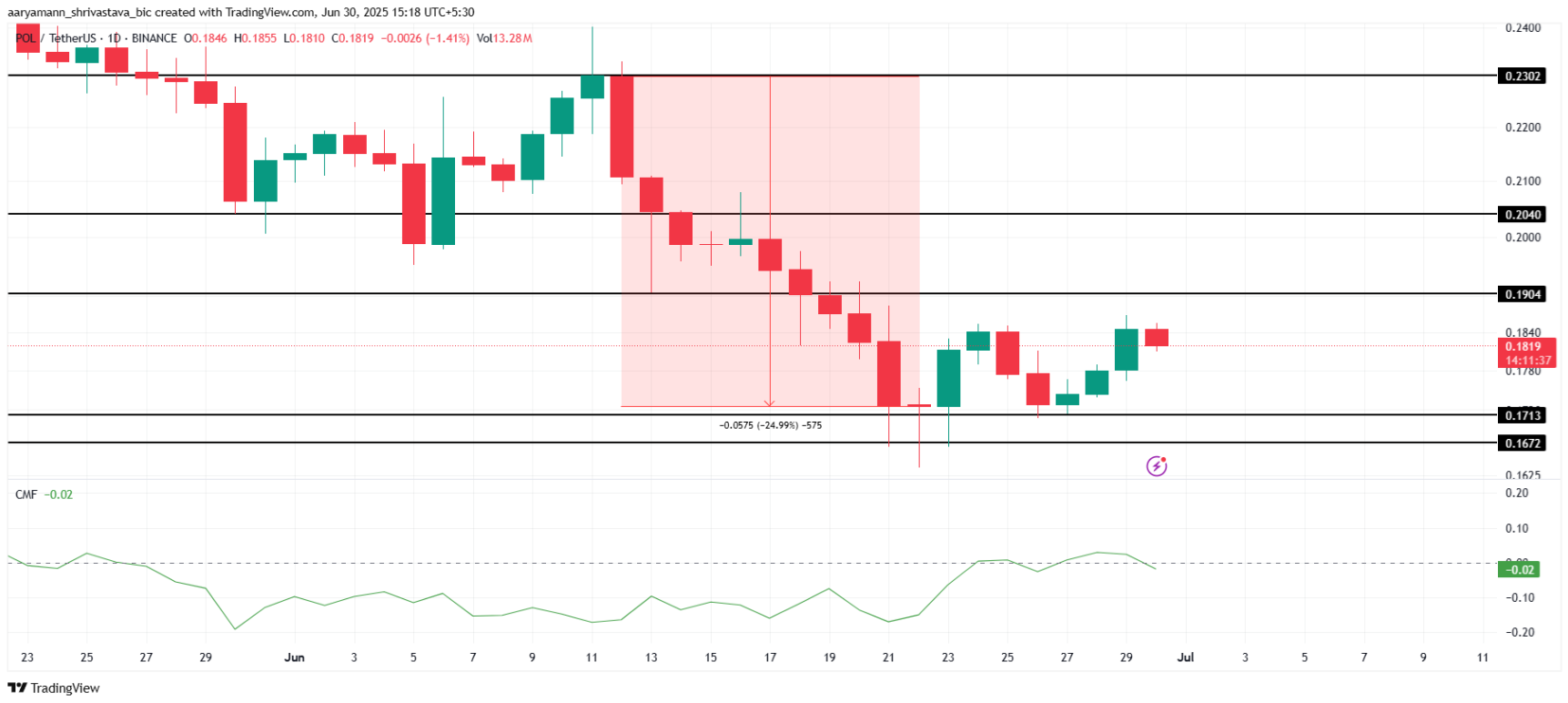 Bên cạnh đó, chỉ báo Chaikin Money Flow (CMF) đang cho thấy dòng tiền đổ vào Polygon có dấu hiệu tăng dần, phản ánh lực cầu tiềm năng trên thị trường. Nếu xu hướng này tiếp tục được duy trì, POL hoàn toàn có thể vượt qua rào cản $0,190 để hướng tới mục tiêu tiếp theo tại $0,204. Ngược lại, trong kịch bản tiêu cực, nếu áp lực mua suy yếu, POL có thể đánh mất vùng hỗ trợ hiện tại và trượt về dưới $0,171, thậm chí phá vỡ mốc $0,167 – qua đó làm suy giảm triển vọng phục hồi trong ngắn hạn.