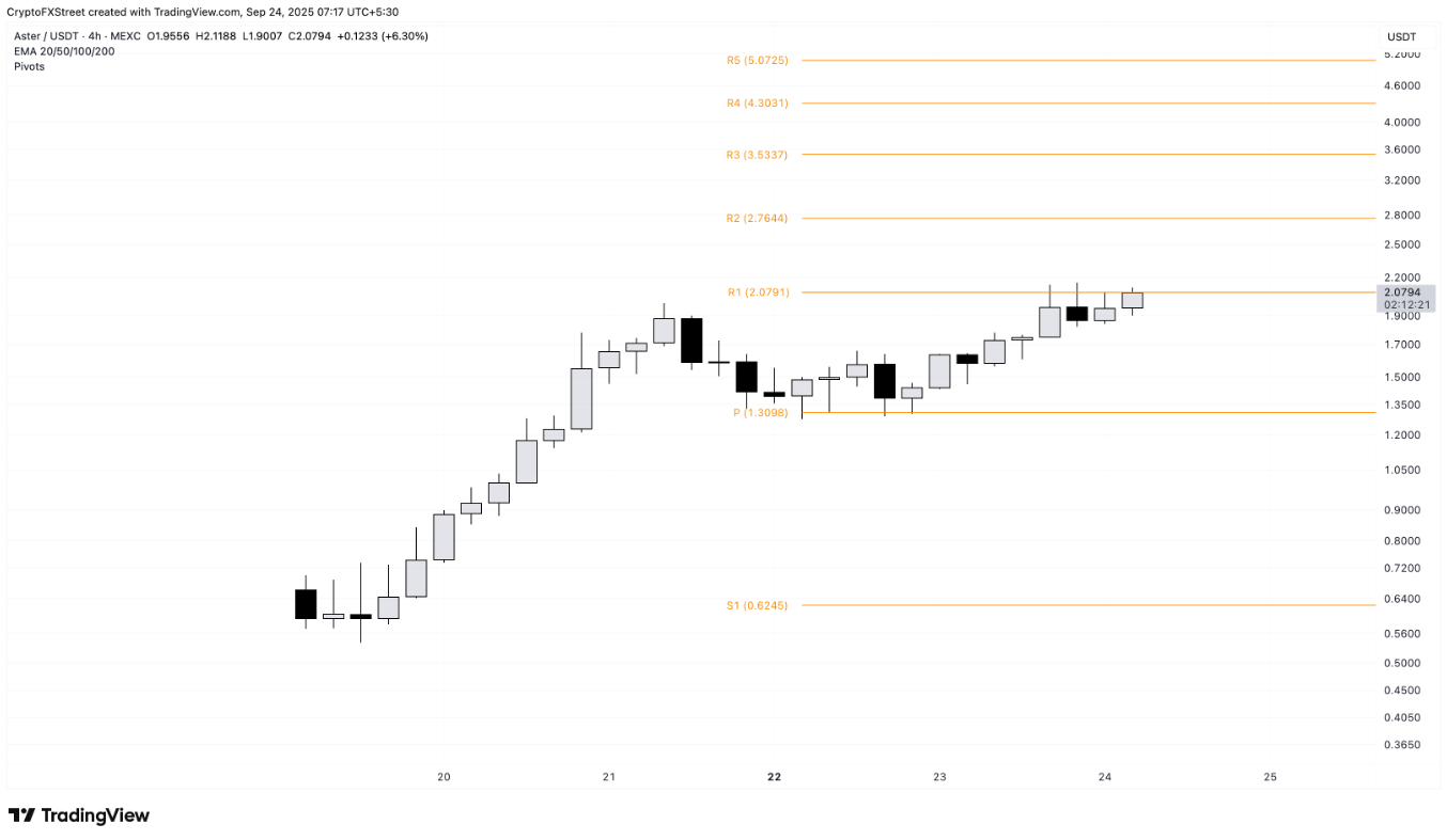Trên khung 4 giờ, ASTER đang chạm ngưỡng cản quan trọng tại pivot R1 ở mức 2,07 USD. Nếu bứt phá và đóng cửa thành công trên mốc này, Aster có thể mở rộng đà tăng hướng tới R2 tại 2,76 USD. Ngược lại, một nhịp điều chỉnh từ 2,07 USD có thể kéo giá quay lại kiểm tra vùng pivot trung tâm ở 1,30 USD.