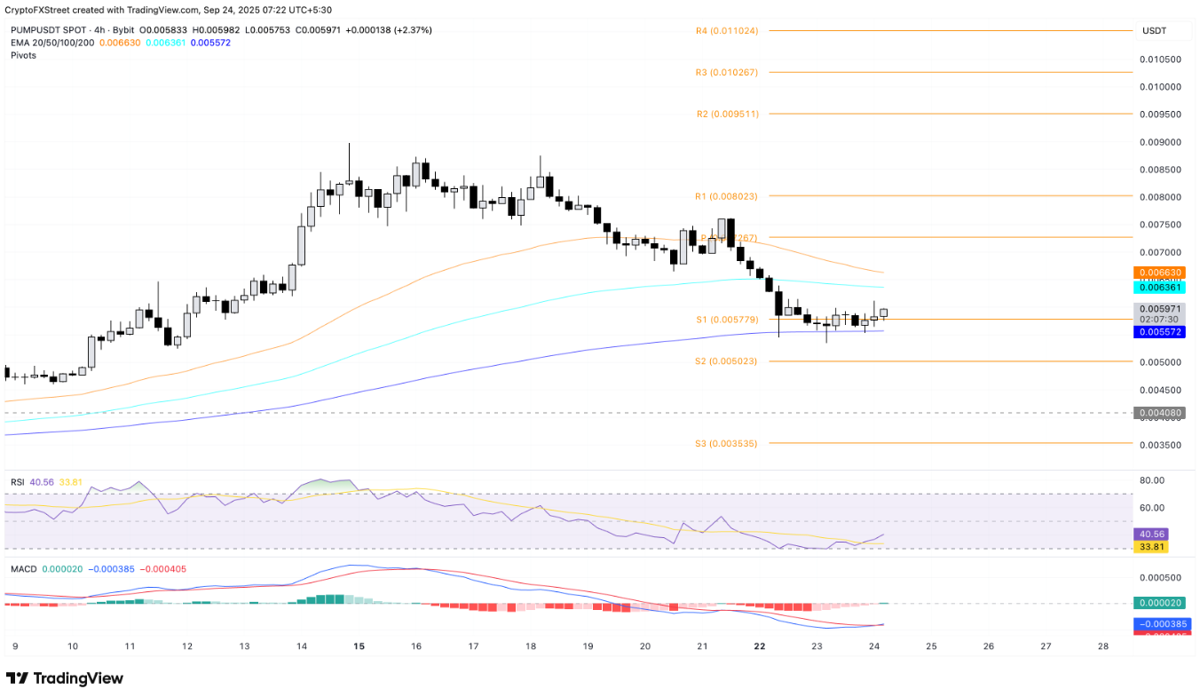 Tại thời điểm cập nhật hôm thứ Tư, Pump.fun (PUMP) giao dịch quanh mức 0,005900 USD, sau khi bật lên từ đường EMA 200 kỳ trên khung 4 giờ. Token này đang duy trì ổn định trên ngưỡng tâm lý quan trọng 0,005000 USD và mức pivot S1 tại 0,005779 USD.